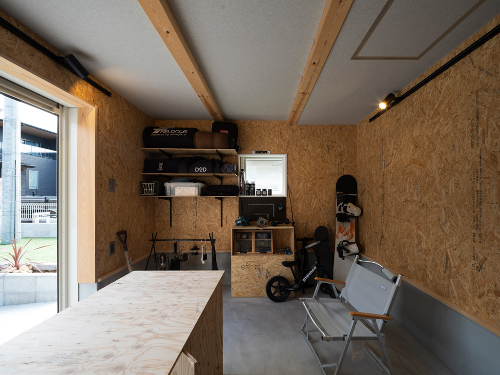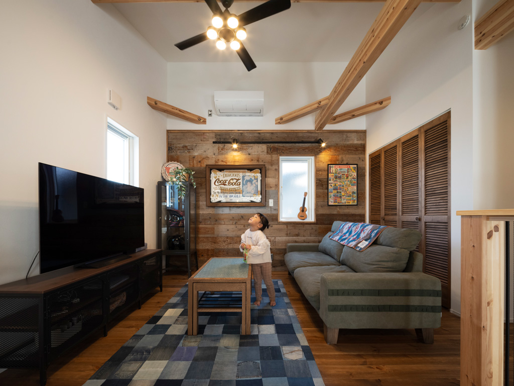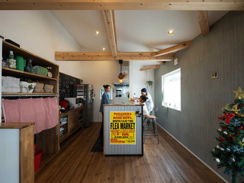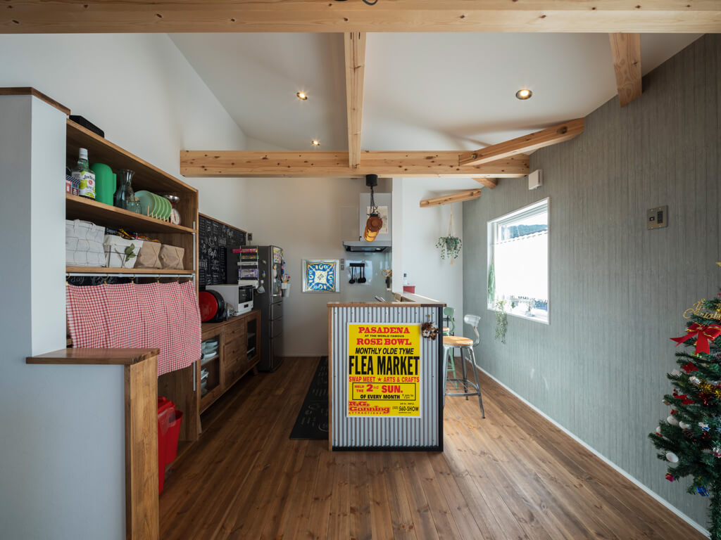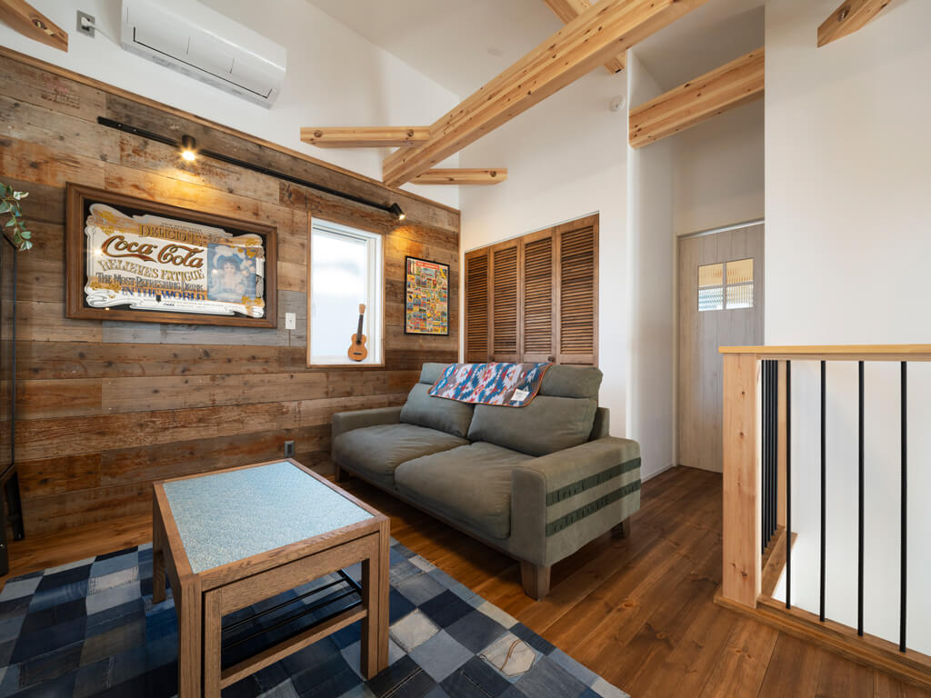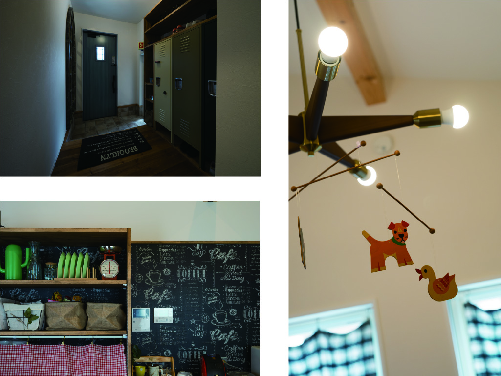まだまだ自慢したいところはいっぱいです。アメリカンテイストのスチールロッカーのサイズに合わせて造作したシューズクローゼット。カフェ風のイラストが描かれたキッチンのクロス。ダイニングのパッチワークラグ。リビングのソファとデニムのラグ。すべて異なるLDKのライト。キャンプ用品や釣りの道具などが並ぶ玄関横のガレージ。家中ぐるりと見渡しても、どこもお気に入りばかりでまさに眼福です。それは家という「空間」と、それを彩る「家具」や「雑貨」がお互いを引き立てあっているから。「大導寺さんのコーディネートやアドバイスのおかげですね。自分たちだけでこんな仕上がりは到底ムリ。ダイニングテーブルもそうですが、実際に福岡県大川市にあるショールームまで同行して、一緒に選んでくださって」。家とインテリアを切り離さず、同時に考えてゆく、なんなら家具ありき!の大栄ハウジングだからこその腕の見せ所でもあります。