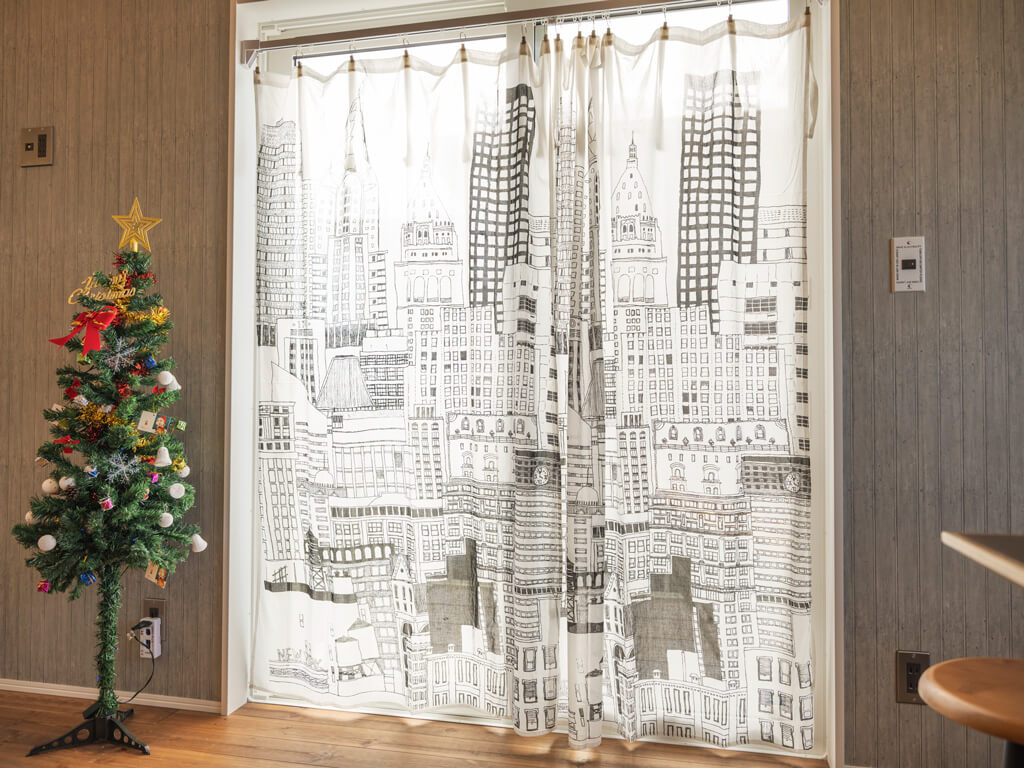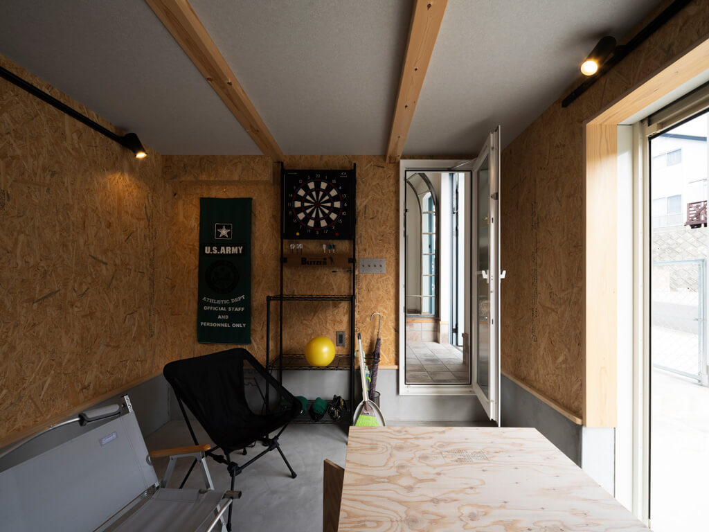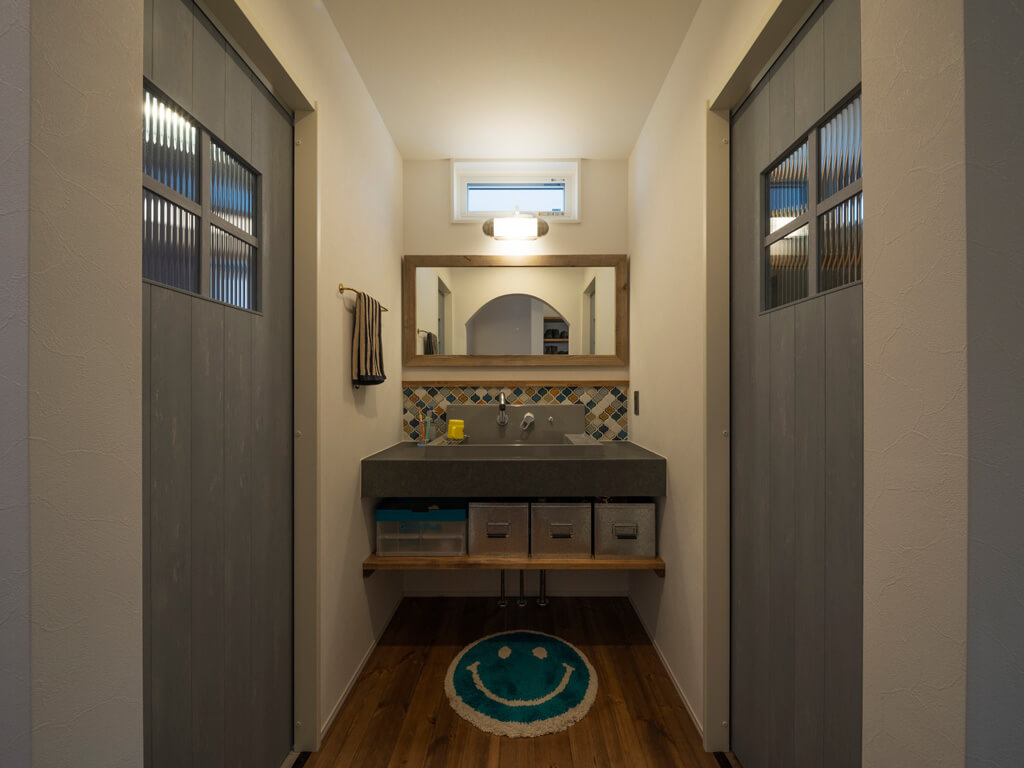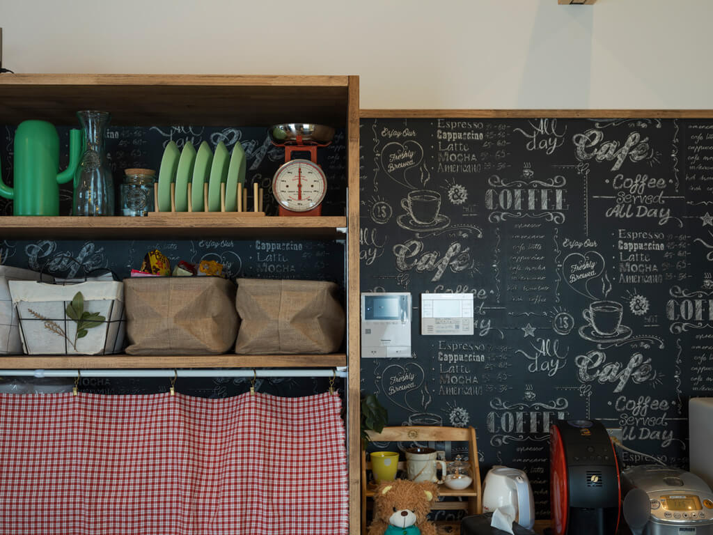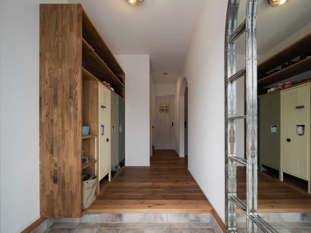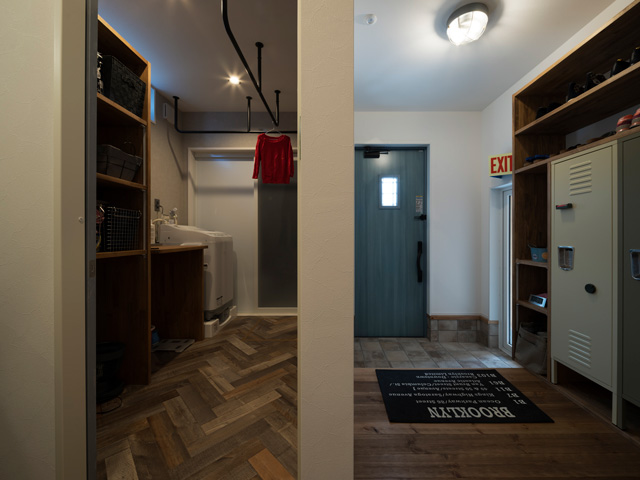 まだまだ自慢したいところはいっぱいです。アメリカンテイストのスチールロッカーのサイズに合わせて造作したシューズクローゼット。カフェ風のイラストが描かれたキッチンのクロス。ダイニングのパッチワークラグ。リビングのソファとデニムのラグ。すべて異なるLDKのライト。キャンプ用品や釣りの道具などが並ぶ玄関横のガレージ。家中ぐるりと見渡しても、どこもお気に入りばかりでまさに眼福です。それは家という「空間」と、それを彩る「家具」や「雑貨」がお互いを引き立てあっているから。「大導寺さんのコーディネートやアドバイスのおかげですね。自分たちだけでこんな仕上がりは到底ムリ。ダイニングテーブルもそうですが、実際に福岡県大川市にあるショールームまで同行して、一緒に選んでくださって」。家とインテリアを切り離さず、同時に考えてゆく、なんなら家具ありき!の大栄ハウジングだからこその腕の見せ所でもあります。