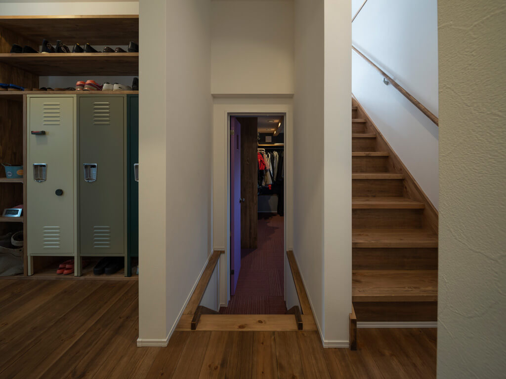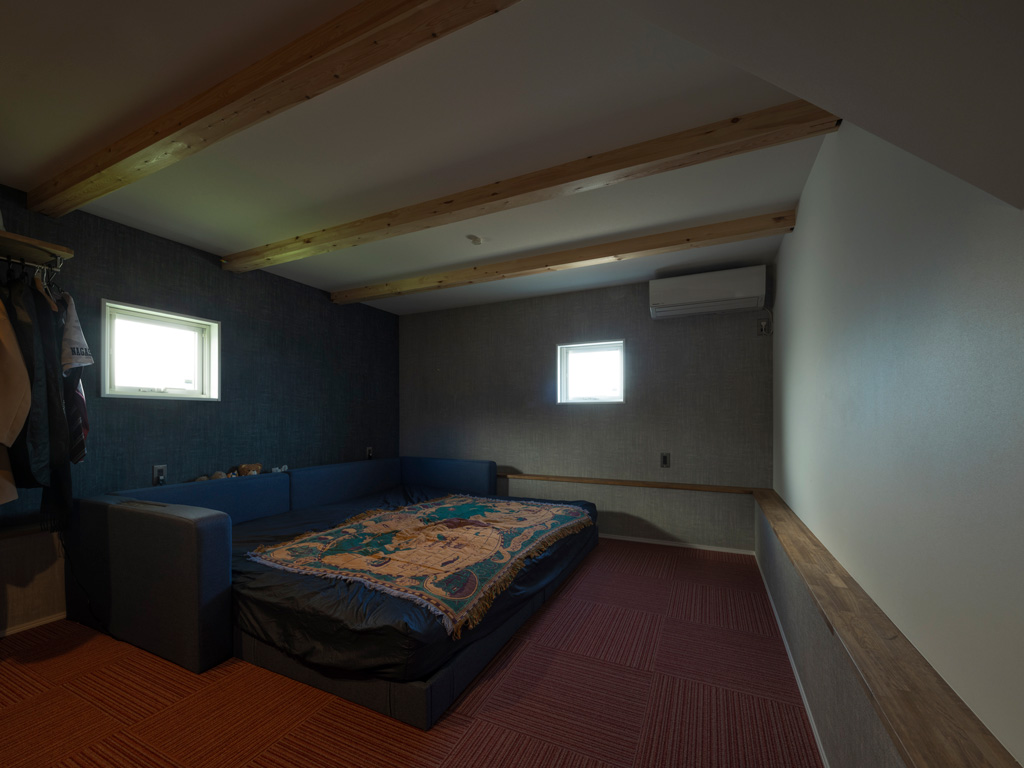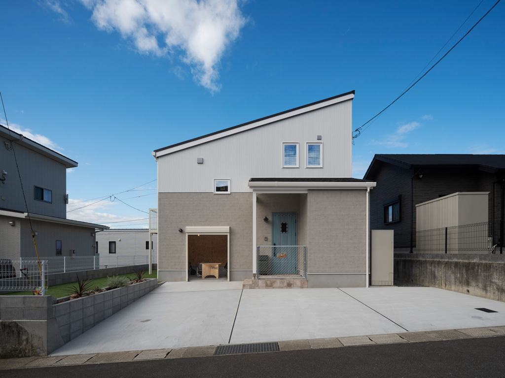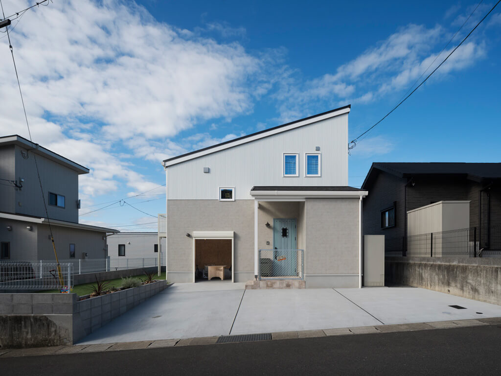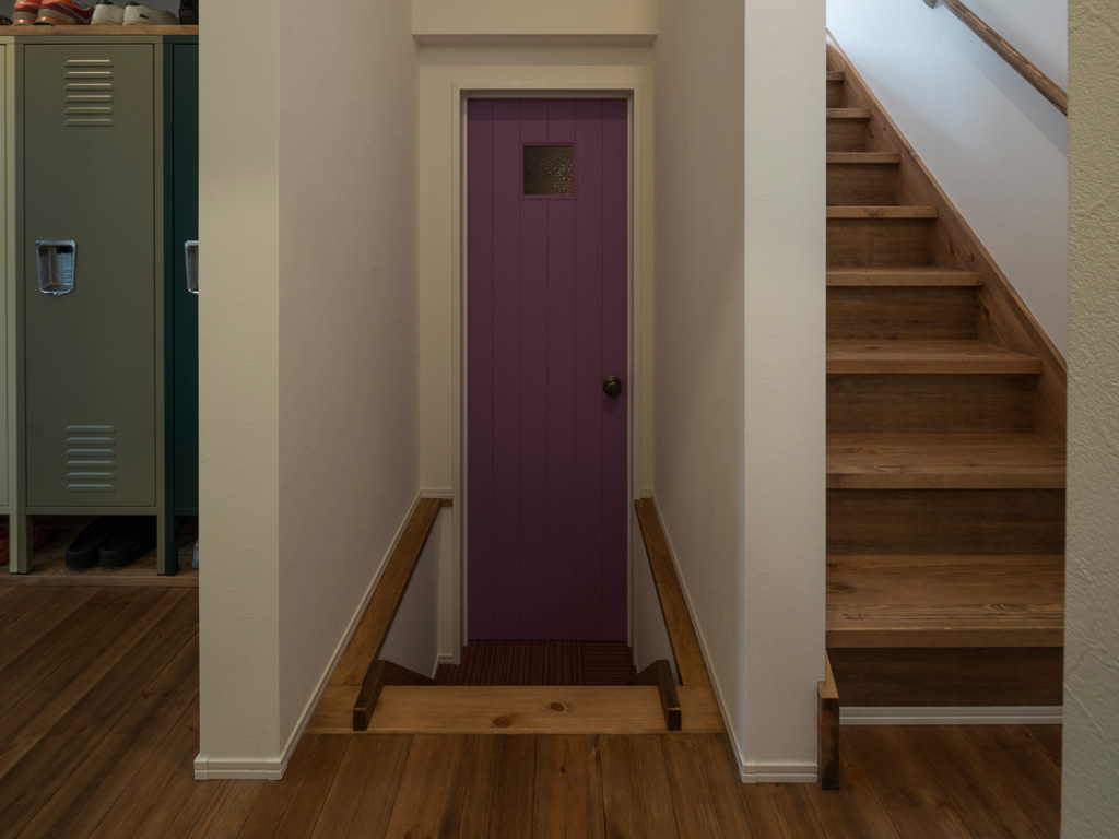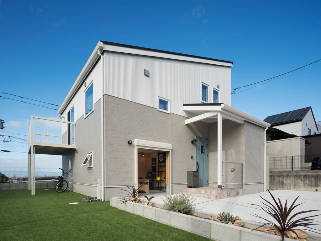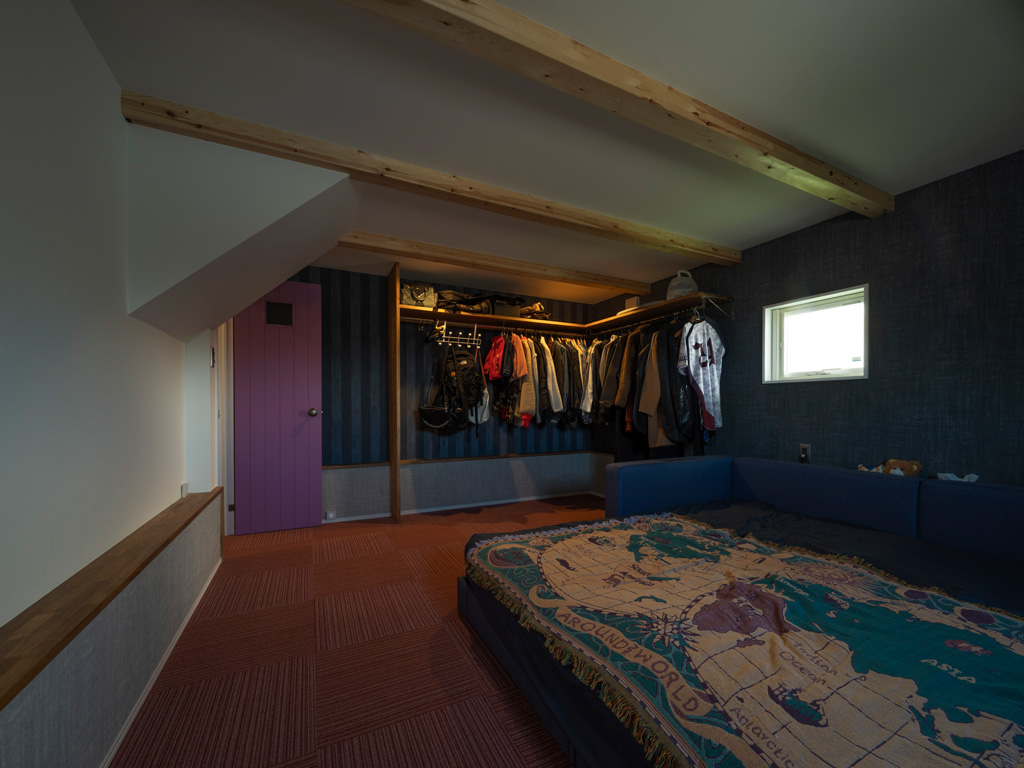 W邸の家づくりのテーマカラーはブルー系。「玄関ドアをこの色にしたくて。外観の配色はそこから決めていきました」。コンクリート調の外壁をメインに、白のガルバニウムでアクセントを添えて。落ち着いたトーンのブルーはさわやかな空の色を思わせます。家の顔となる玄関まわりとは対照的に、0.5階の寝室は落ち着いたトーンに。ドアは奥さまが好きな紫、クロスは2人とも好きなデニム調でコーディネート。「はじめは紫でだいじょうぶ?って思ったけど、いい感じに仕上がったよね」「そうでしょ」と、他愛もないやり取りからも仲のよさがうかがえます。一面だけの白いクロスにしているのはプロジェクターを投影するため。ここはベッドルームでもあり、シアタールームでもあるんです。