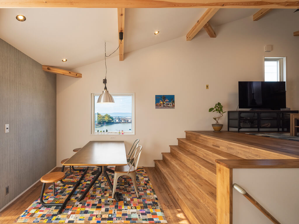 光を取り込んだり、さわやかな風を運んだり。家の内側と外側をつなぐ「窓」はどの家にも必ずあるもの。だからこそ、見逃してしまいがちですが、位置やサイズによって暮らしは大きく変わります。「森のように四方に枝を広げる木々、夜にちらりとのぞく月。新幹線や飛行機が行き交う姿も見ることができます。そのときどきで変化する景色を見るのが楽しくて」。そう話す奥さまの言葉どおり、窓は外の豊かさや楽しさを切り取ってくれるアートフレームでもあります。ここまでは、どこの家でもあるハナシ。だけどW邸が特別なのは湖という、ほかにはない「絵になる眺め」があるからこそ。ある一瞬の美しさをつぶさに感じられる景色と一緒に暮らすために、1.5階と2階にLDKがあるBinOのWAVEを選びました。